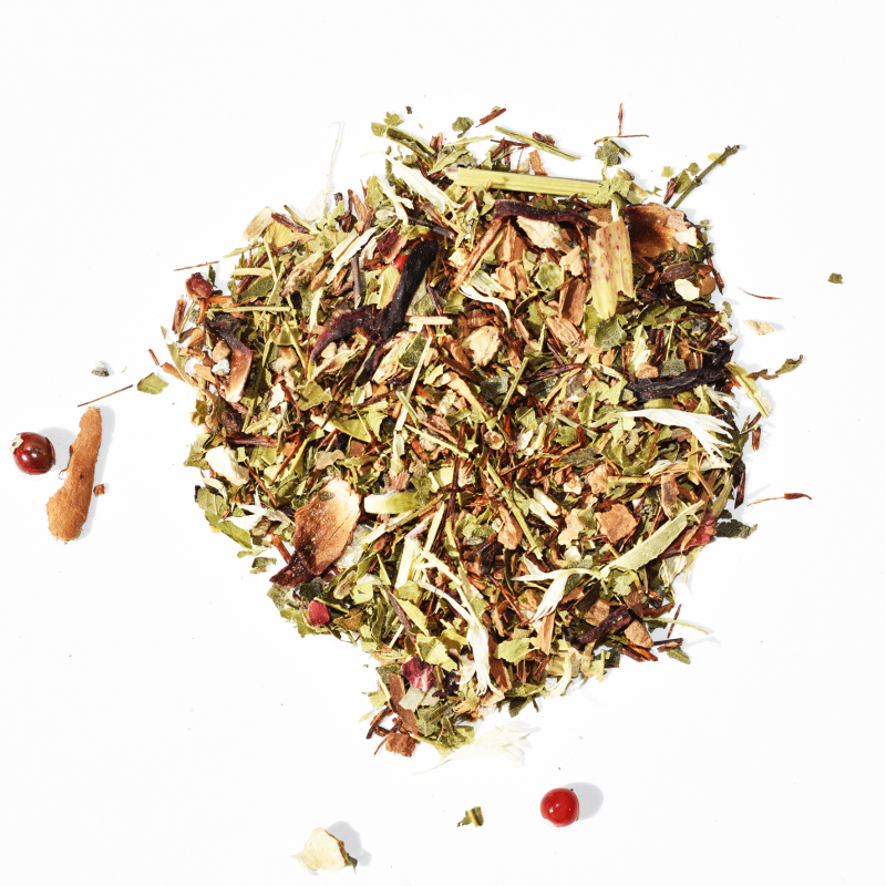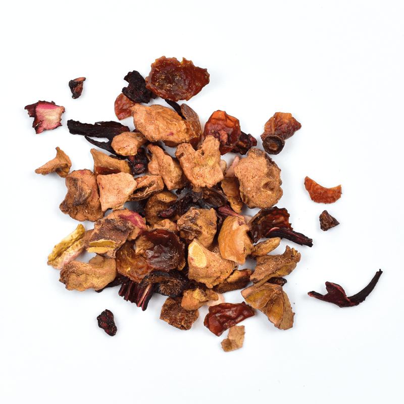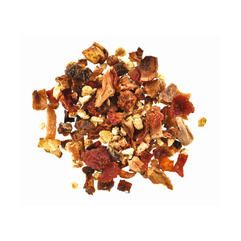 Parsemée de copeaux de cannelle, d'écorces de citron et de dés de pomme ce mélange à base de verveine citronnée et de rooïbos vous offre une liqueur fraîche et légèrement sucrée vous remémorant les saveurs de Noël.